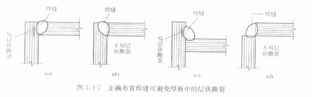 要避免層狀撕裂、焊縫的正確布置非常的重要。圖1.4-7給出了由兩塊鋼板組成的兩個角節點的兩種焊縫布置。圖1.4-7a和圖1.4-7c的布置形式,易使鋼板產生層狀撕裂。改成圖1.4-7b和圖1.4-7d所示的形式后就不易產生層狀撕裂。