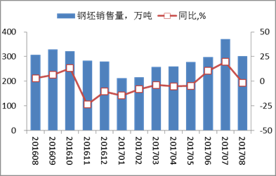 圖1重點鋼鐵企業鋼坯銷售量及同比
