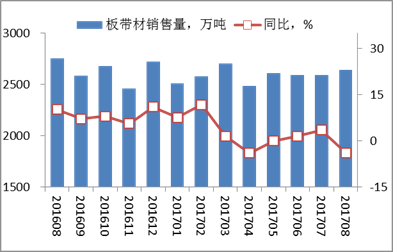 本月,重點鋼鐵企業銷售板帶材2644.17萬噸,比去年同期減少106.82萬噸,下降3.88%;截止本月,本年累計銷售板帶材20725.90萬噸,累計比去年同期增加408.96萬噸,上升2.01%。