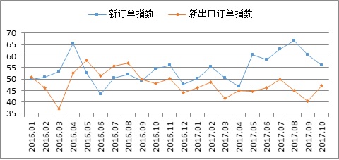 10月是傳統的旺季,從市場表現上來看,本月的市場需求繼續擴張。10月份新訂單指數為55.9%,較上月回落4.7個百分點,仍處于擴張狀態;新出口訂單指數為47.2%,比上月顯著上升6.7個百分點。兩個指數的走勢表明,國內市場需求增速放緩,出口明顯改善。