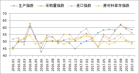 圖2 2016年以來生產指數、采購量指數、進口指數和原材料庫存指數變化情況