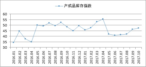 10月份產成品庫存指數為47.5%,較上月小幅上升1.2個百分點,但指數仍處于50%以下的收縮區間,表明雖然產成品庫存有小幅增加,但鋼廠生產與銷售銜接整體仍然順暢。庫存增加更多是受華北部分基建工程因環保因素停工,以及東北、西北等地因天氣因素需求減弱影響,從而在一定程度上延緩了鋼材提貨。據中鋼協統計,截止2017年10月上旬末重點鋼鐵企業鋼材庫存量為1342.42萬噸,旬環比增加121.31萬噸,上升9.93%;較9月上旬末增加106.53萬噸,增幅8.62%;較去年同期減少45.16萬噸,減幅3.25%。