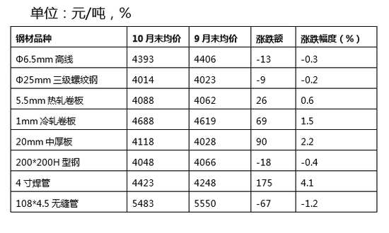 蘭格鋼鐵云商平臺(tái)監(jiān)測(cè)的8大鋼材品種10大城市均價(jià)顯示,截至10月31日,各品種價(jià)格走勢(shì)對(duì)半分化,高線(xiàn)、三級(jí)螺紋鋼、H型鋼和無(wú)縫管有所下跌,其中無(wú)縫管跌幅最大,為1.2%;而熱軋卷板、冷軋卷板、中厚板、焊管有所上漲,其中焊管漲幅最大,為4.1%(詳見(jiàn)表1)。