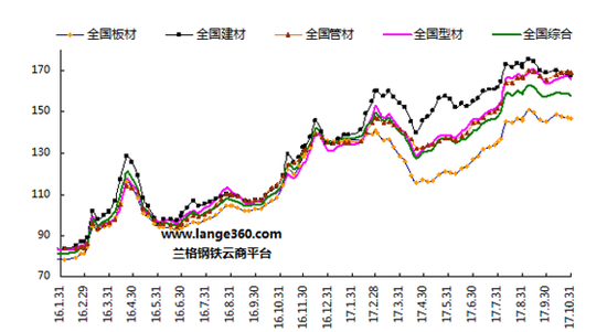 10月份,國(guó)內(nèi)鋼鐵市場(chǎng)呈現(xiàn)高位震蕩的局面。據(jù)蘭格鋼鐵云商平臺(tái)監(jiān)測(cè)數(shù)據(jù)顯示,截至10月31日,蘭格鋼鐵全國(guó)鋼材綜合價(jià)格指數(shù)為157.8,較上月末上升0.3%,年同比上升41.1%。其中,建材價(jià)格指數(shù)為167.8,較上月末下降0.8%,年同比上升46.6%;板材價(jià)格指數(shù)為146.5,較上月末上升0.9%,年同比上升34.4%;型材價(jià)格指數(shù)為165.6,較上月末上升1.2%,年同比上升48.9%;管材價(jià)格指數(shù)為169.0,較上月末上升1.8%,年同比上升46.6%(詳見(jiàn)圖1)。