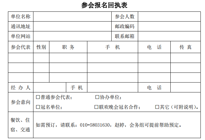 1、參會(huì)單位填寫此表并與匯款憑證一起傳真至 010—58031630,或電郵:1113750636@qq.com,聯(lián)系人:趙婷