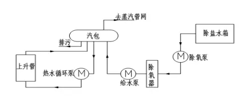 通過上升管換熱器結構設計,采用納米導熱材料導熱和焦油附著,采用耐高溫耐腐蝕合金材料防止荒煤氣腐蝕,采用特殊的幾何結構保證換熱和穩定運行有機結合,將焦爐荒煤氣利用上升管換熱器和除鹽水進行熱交換,產生飽和蒸汽,將荒煤氣的部分顯熱回收利用。工藝流程圖如下: