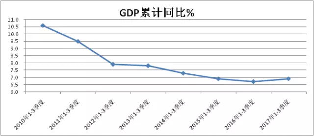 一是2017年1~3季度國內生產總值(GDP)為59.33萬億元,同比增長6.9%,增速較2016年同期提高了0.2個百分點。這是2010年以來GDP累計增速首次出現回升(見圖1)。同時,GDP增長結構不斷優化,實體經濟發展明顯向好,工業GDP增長6.4%,分別比2015年同期、2016年同期高出0.3個百分點、0.4個百分點。