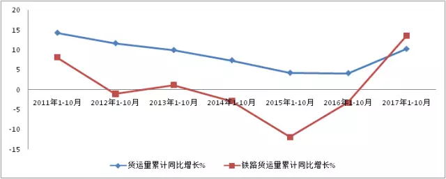 ▲ 圖2 近7年各年度1-10月份貨運量累計同比、鐵路貨運量累計同比(%)