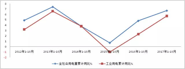 ▲ 圖3 近6年各年度1-10月份全社會用電量累計同比、工業用電累計同比(%)
