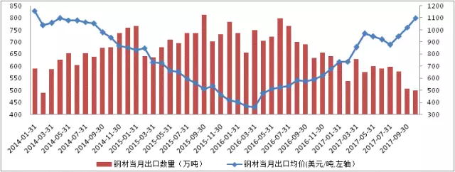 今年10月份鋼材出口量為497.9萬噸,創2014年3月份以來最低值;10月份鋼材出口均價為798.84美元/噸,創2014年2月份以來最高值(見圖4)。1~10月份,鋼材出口量為6448.8萬噸,累計下降30.4%(其中“其他熱軋合金條桿”出口減少1713.47萬噸),鋼材出口金額為451.95億美元,僅累計下降0.3%;鋼材累計出口均價為700.83美元/噸,較2016年同期增長了211.08美元/噸,增幅達43.1%。鋼材出口數量的大幅下降并沒有帶來出口金額的同步下降以及鋼材出口均價的大幅上漲均表明出口鋼材結構、品質的提升。