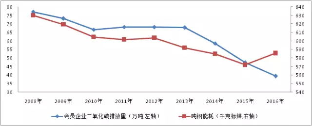 ▲ 圖5 鋼鐵協會會員企業二氧化硫排放量及噸鋼綜合能耗