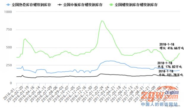 截止2018年1月18日,最新鋼材庫存數據出臺,其中全國35個主要城市螺紋鋼庫存量為416.67萬噸,環比升27.74萬噸,升7%;而全國主要城市中厚板庫存量為101.78萬噸,環比升2.7萬噸,升2.7%;全國主要城市熱卷庫存量為176.83萬噸,環比升2.25萬噸,升1.3%;從最新庫存數據來看,螺紋鋼等建材庫存量上升最為明顯。但相比去年同期同比,仍處于相對低位水平。