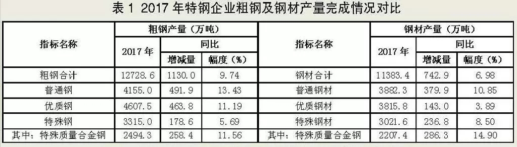 2017年特鋼企業(yè)粗鋼及鋼材產(chǎn)量完成情況對(duì)比如表1所示。