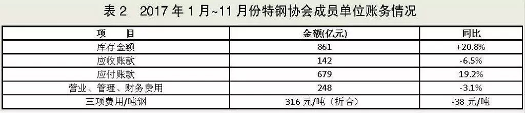 王懷世表示,2017年特鋼企業(yè)經(jīng)營(yíng)管理狀況有所改善,資金壓力略有減輕。2017年1月~11月份特鋼協(xié)會(huì)成員單位財(cái)務(wù)情況如表2所示。