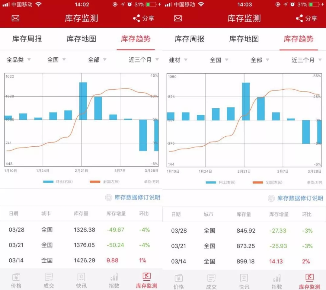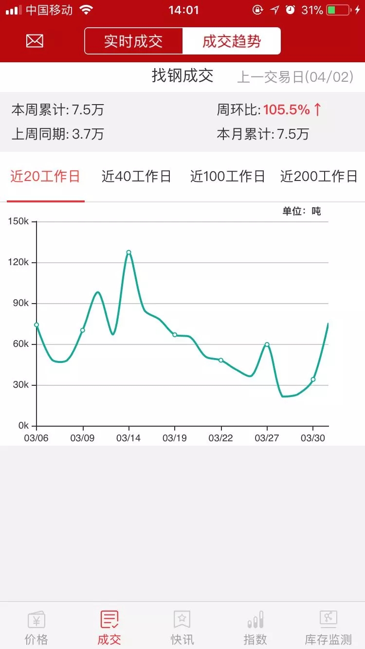 上圖為找鋼網平臺近20個工作日成交量趨勢圖。考慮到3月底有三個交易日找鋼網因盤庫暫停交易,整體成交依然較為低迷,兩會結束后需求并未爆發,市場成交較為平靜。