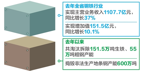 從運行情況看,全省鋼鐵行業運行平穩趨好。去年,全省鋼鐵行業實現主營業務收入1107.7億元,同比增長37%。全行業實現增加值151.5億元,同比增長10.1%,自2013年以來首次呈兩位數增長。主要產品產量穩步提高,其中,生產生鐵1322萬噸,增長3.5%;粗鋼1517.5萬噸,增長7.1%;鋼材1607萬噸,下降2.9%;生產鐵合金94.5萬噸(含工業硅60萬噸),增長28.7%;生產鐵礦石原礦量2717萬噸,增長16.4%。
