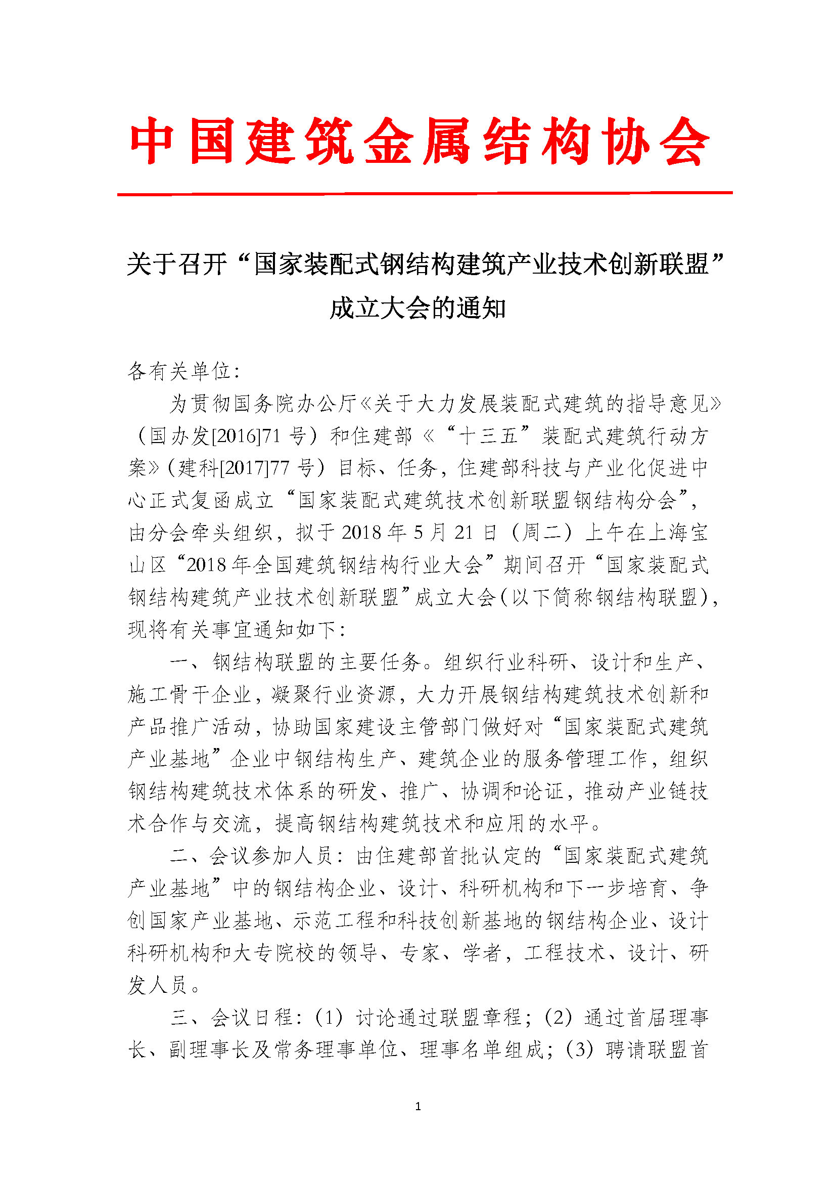 關(guān)于召開(kāi)“國(guó)家裝配式鋼結(jié)構(gòu)建筑產(chǎn)業(yè)技術(shù)創(chuàng)新聯(lián)盟”成立大會(huì)的通知